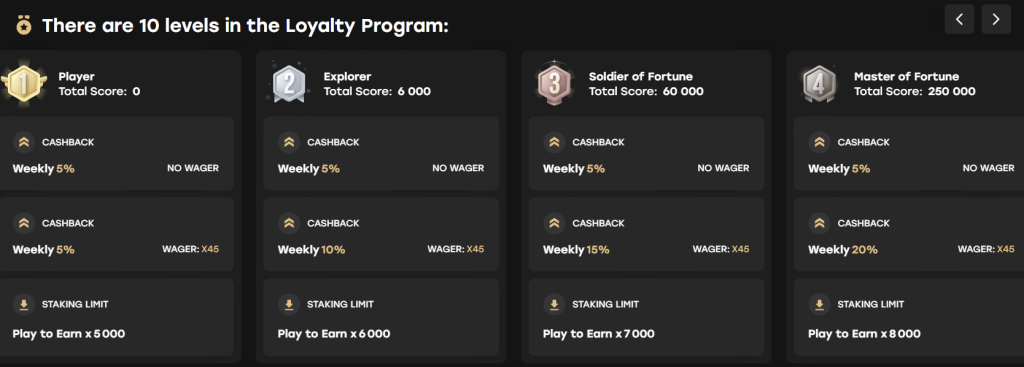 - Level 1 (Player): Acesta este punctul dumneavoastră de plecare. Chiar și aici nu rămâneți cu mâna goală – puteți savura un cashback săptămânal de 5%, fără nicio cerință de rulaj.